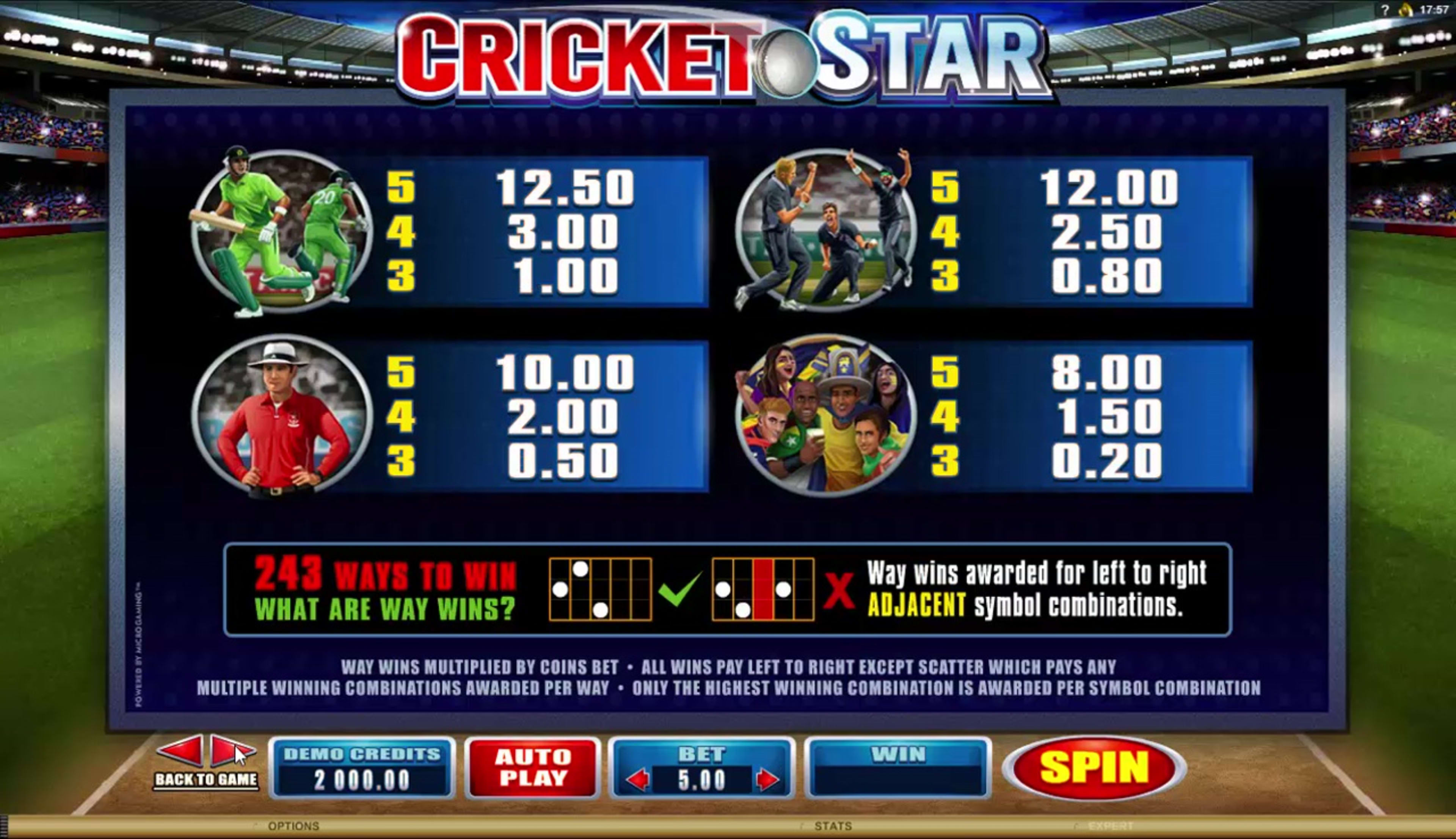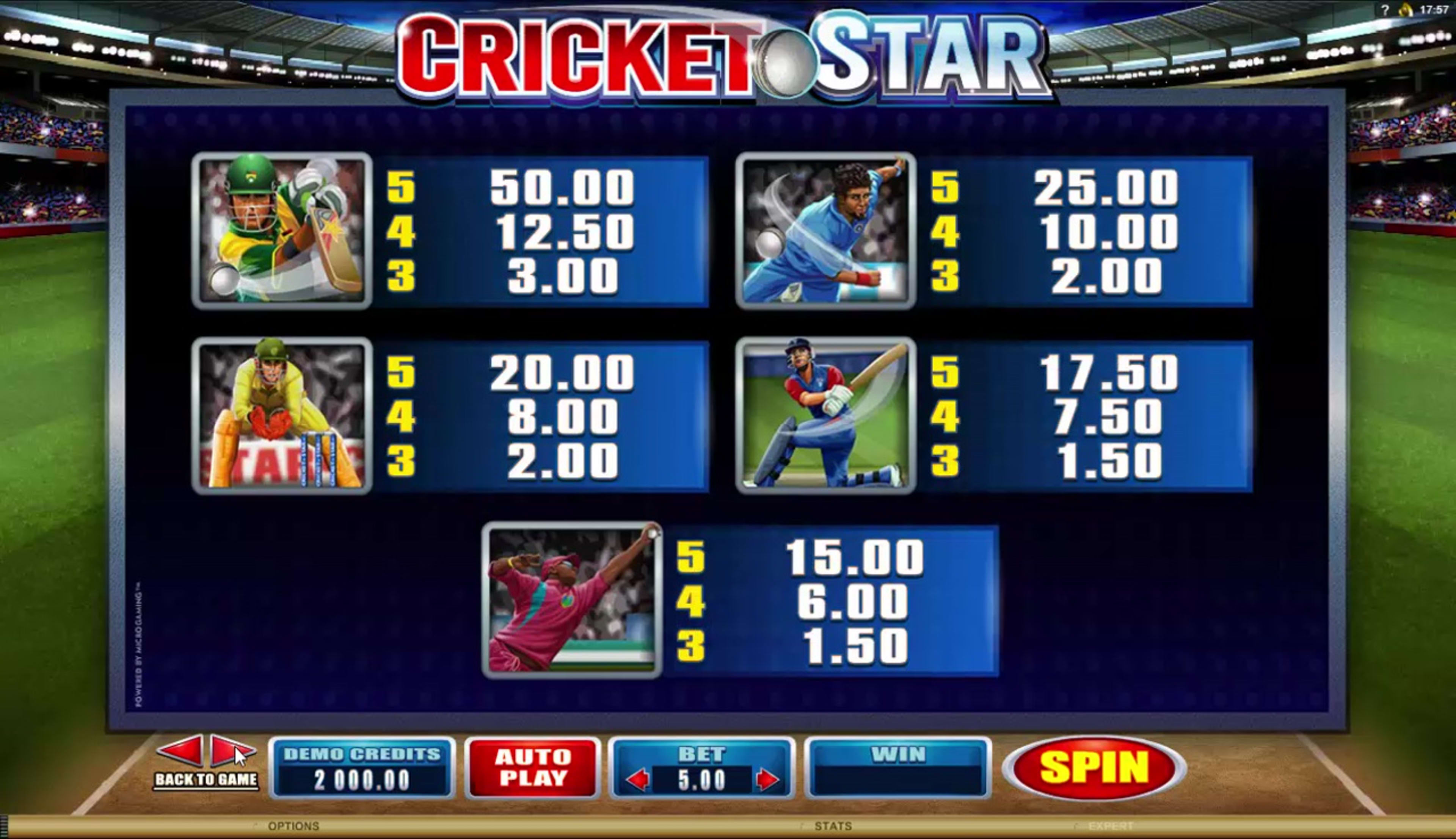 Cricket Star adalah salah satu dari beberapa mesin slot yang terinspirasi oleh olahraga cricket, yang cukup populer di beberapa bagian dunia, tetapi tidak terlalu dikenal di Barat. Mungkin tidak mendapat banyak perhatian dari perusahaan lain, tetapi Microgaming melakukan pekerjaan dengan baik dengan permainan ini, dan hasilnya seharusnya menyenangkan sebagian besar penggemar kriket. Tata letak Cricket Star terdiri dari 5 gulungan yang memiliki 3 simbol masing-masing, dengan total 243 cara untuk menang memungkinkan Anda untuk membentuk kombinasi. Kemenangan yang Anda dapatkan dari Cricket Star akan menghasilkan hingga $ 62.500 di rekening bank Anda, meskipun Anda pertama-tama perlu bertaruh cukup besar untuk mencapai level itu. Fitur-fiturnya terlihat sangat bagus, termasuk di sini simbol scatter, wild stacked dan free spin yang memiliki Rolling Reels yang dapat menerapkan pengganda hingga 10x.