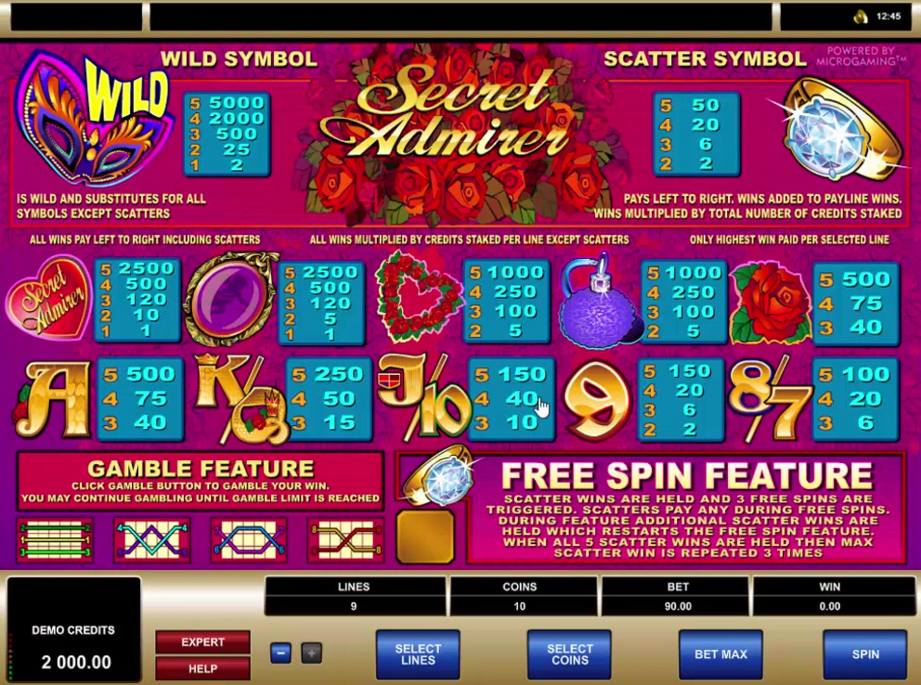 Secret Admirer adalah mesin slot untuk orang-orang yang cenderung romantis, jenis permainan yang Anda cari setiap Februari, dekat Hari Valentine. Lebih dari mesin slot lain dengan acara tahunan yang sama untuk fokus, ia memiliki keuntungan menjadi sesuatu yang bisa dimainkan sepanjang tahun, terutama oleh mereka yang sedang jatuh cinta atau hanya merasa romantis. Pengagum Rahasia memiliki 5 gulungan dan memberi Anda 1 hingga 9 garis untuk diaktifkan untuk setiap putaran. Ini bisa menjadi mesin slot yang sangat mahal, tetapi itu juga berarti bahwa ia dapat menawarkan pembayaran besar, hingga $ 500.000. Fitur bijaksana itu tidak melakukan yang baik, hanya menawarkan liar standar dan mencerai-beraikan, dengan berputar bebas dipicu oleh yang terakhir.